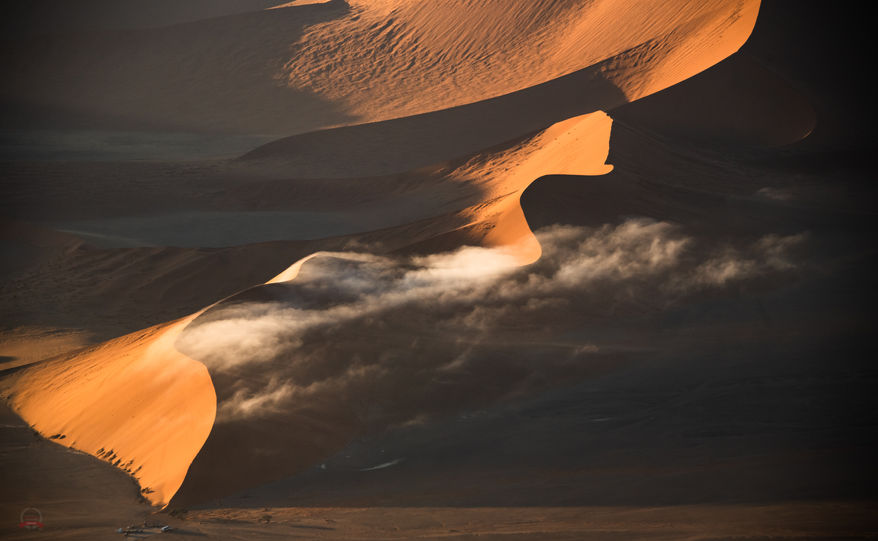 In the early hours of an exceptional January morning in Sossusvlei, in the Namib Desert, Namibia, Africa two other photographers and I embarked on a gob smack helicopter ride. A few minutes after we took off, we witnessed history: a huge sea of fog had taken over the dunes! The clouds were playing with the sunlight and the ridges of the dunes. We were swinging with the hot air and our cameras were releasing images that not many of us have.